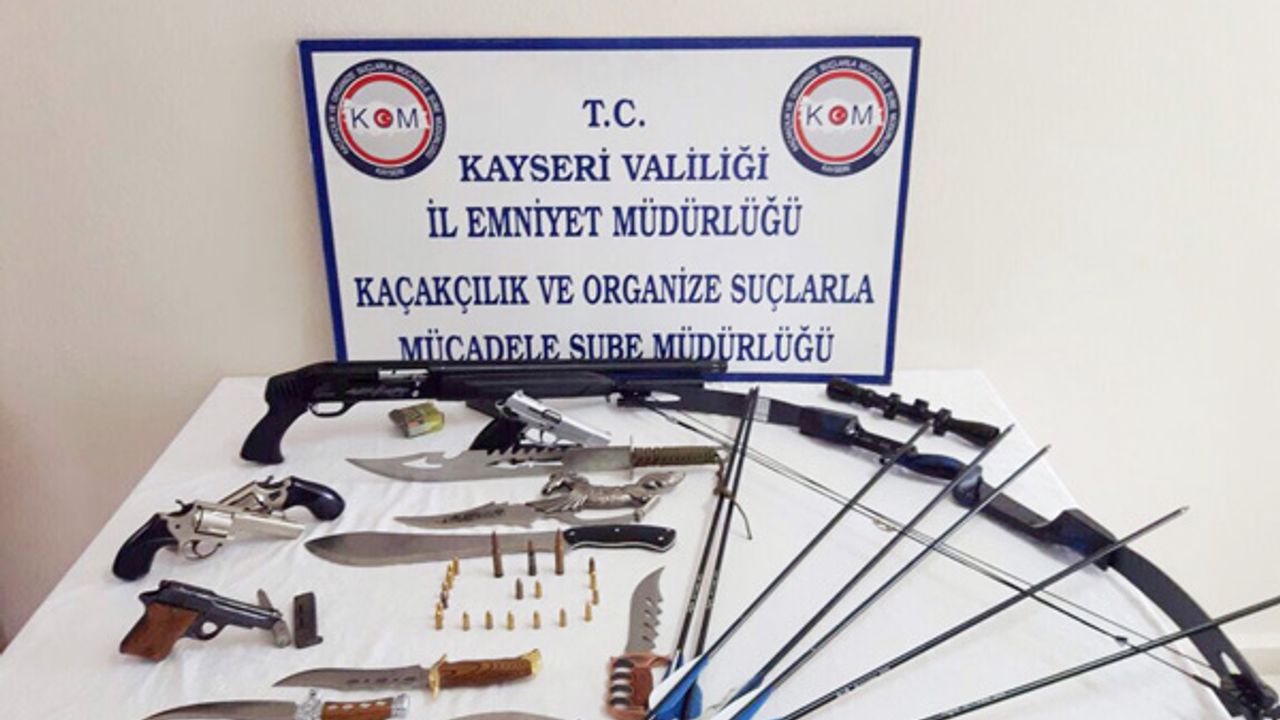 1 ruhsatsız tabanca, 1 adet ruhsatsız av tüfeği, 3 adet kuru sıkı tabanca, 21 adet tabanca fişeği, 49 adet kuru sıkı tabanca fişeği, 1 adet yay, 7 adet ok, 1 adet tüfek dürbünü, 1 adet pala, 2 adet kasatura, 5 adet kama.