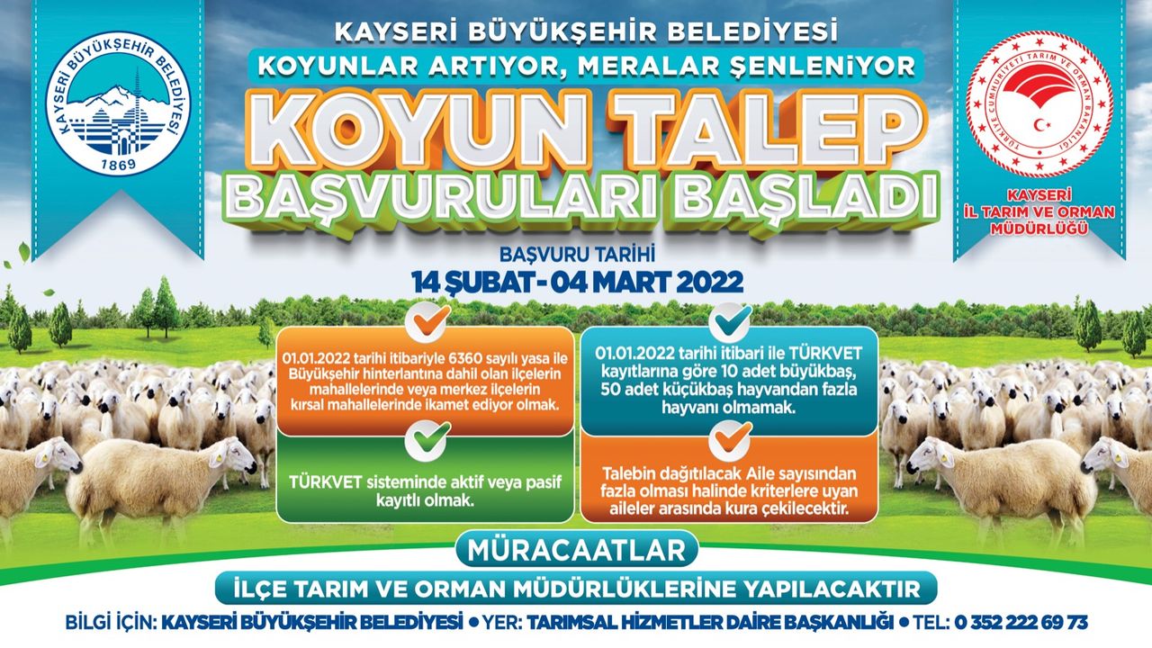 Başvuruları, 14 Şubat’ta başlayan ‘Koyunlar Artıyor, Meralar Şenleniyor’ projesine, 4 Mart’a kadar başvuru yapılabilecek. Başvuru için aranan kriterler ise 01.01.2022 tarihi itibari ile 6360 sayılı yasayla Büyükşehir hinterlandına dâhil olan ilçelerin mahallerinde veya merkez ilçelerin kırsal mahallelerinde ikamet ediyor olmak, TÜRKVET sisteminde aktif veya pasif kayıtlı olmak, 01.01.2022 tarihi itibari ile TÜRKVET kayıtlarına göre 10 adet büyükbaş, 50 adet küçükbaş hayvandan fazla hayvanı olmamak şeklinde belirlendi.