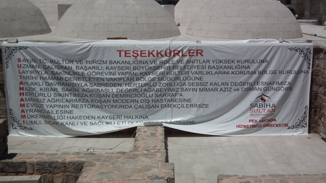 1205 yılında yaptırılan tarihi hamama Teşekkür pankartı hazırlayan mülkiyet sahibi, baş harflerini birleştirdiğinde ‘Sultan Hamamı’ yazan akrostişli şiirle tüm Kayseri halkına teşekkür etti. Kültür ve Turizm Bakanlığı, Anıtlar Kurulu, Büyükşehir Belediyesi, esnaflar ve mükemmelliği hak eden Kayseri Halkına teşekkür yazısı dikkat çekti.