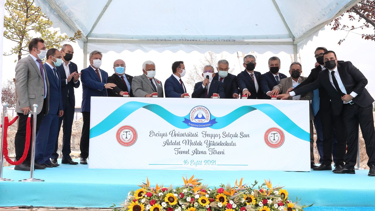 Konuşmaların ardından protokol, dualar eşliğinde Feyyaz Selçuk San Adalet Yüksekokulu’nun temel atma töreni için butona bastı.
