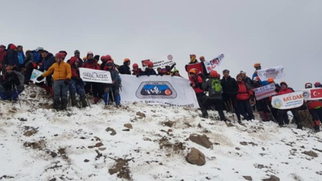 Yaklaşık 125 dağcının katıldığı Erciyes Zirve Tırmanışı'nda zirveye ulaşan dağcılar hatıra fotoğrafı çektirdi.