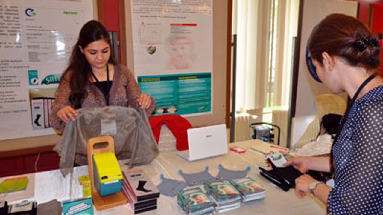 Sergi salonunda ise, birbirinden ilginç 70 proje sergileniyor. Projeler arasında robotik orkestra, işletmelerde robot teknolojisinin kullanılması, LED aydınlatma sistemleri, radyasyon önleyici kumaş dikkat çekiyor. Ürettikleri kumaşın radyasyonu geçirmediğini ifade eden firma yetkilisi, ''Bu kumaşla üretilen giysiler ve şapka, başlık ya da çoraplar, radyasyonu geçirmiyor. Dolayısıyla kullanıcıyı radyasyonun kötü zararlarından koruyor'' dedi.