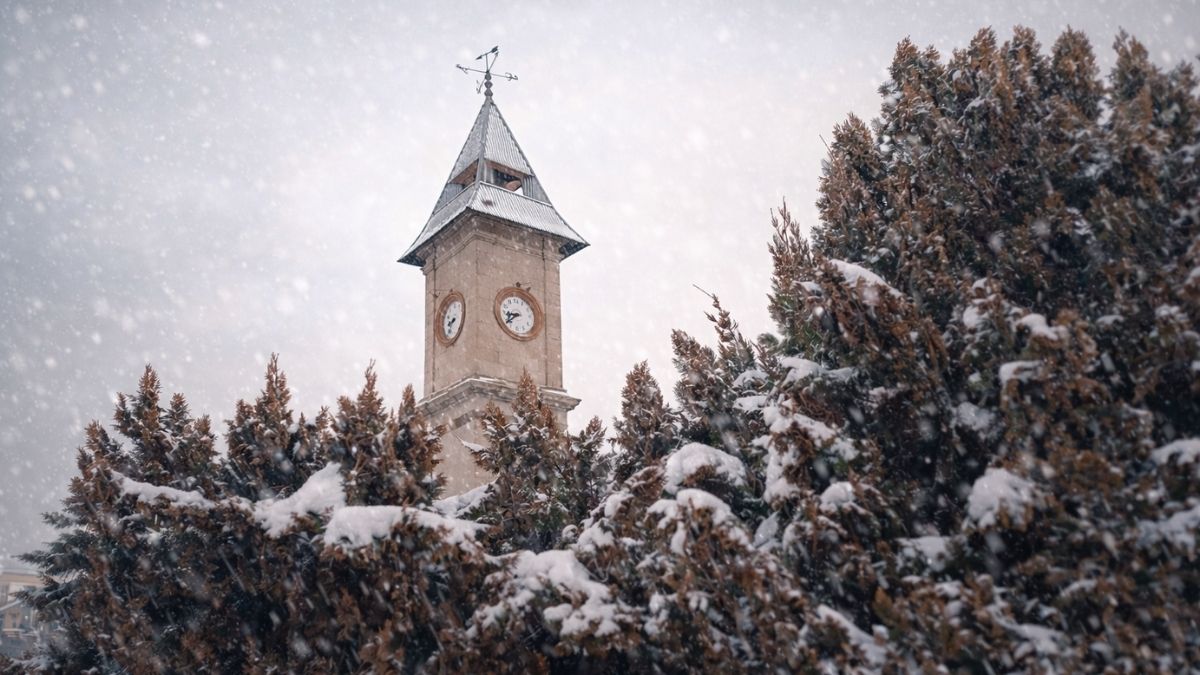 Karla kaplanan ağaçların arasından yükselen tarihi yapı, meydanda kış atmosferini yansıttı. Yağışın aralıklarla devam ettiği saatlerde çevredeki hareketliliğin azaldığı görüldü. Saat Kulesi, beyaz örtüyle birlikte gün boyunca objektiflere yansıyan kartpostallık görüntüler oluşturdu.