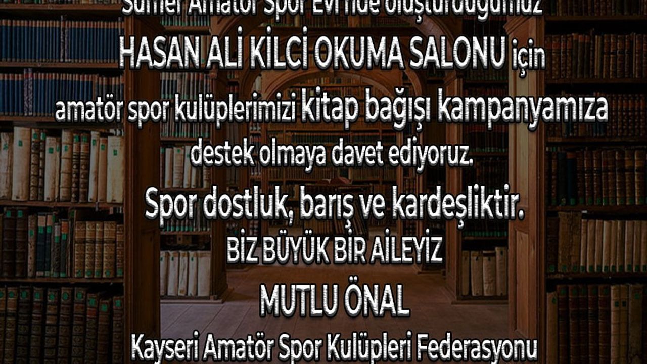 Kayseri Amatör Spor Kulüpleri Federasyonu Başkanı Mutlu Önal, yeni projeler ile amatörlere hizmet etmeye devam ettiklerini söyledi. Seçim vaatleri arasında bulunan okuma salonu için çalışmaların tamamlandığın dile getiren Önal, “Sümer Amatör Evi içerisinde yer alan bir salonumuzu okuma salonuna çevirdik. Buraya Kayseri sporuna büyük hizmetler vermiş Rahmetli Hasan ali Kilci’nin ismini verdik. Şimdi tüm amatör kulüplerimizi kitap bağışı kampanyamıza destek olmaya bekliyoruz. Spor dostluk, barış ve kardeşliktir. Biz büyük bir aileyiz. Okuma salonumuzu yine bizler kitaplarımız ile dolduracağız. Kitaplarımızın da gelmesi ile tüm spor paydaşlarımızı okuma salonumuza bekliyoruz” dedi. İHA