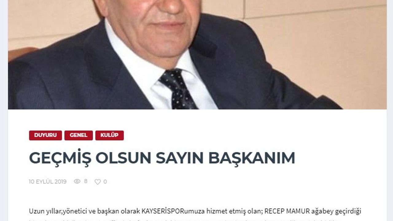 Sarı Kırmızılı kulüpteki hesaplar ile ilgili yaptığı açıklamalardan ötürü İstikbal Mobilya Kayserispor'da en uzun dönem başkanlık yapan Mamur ile arası açılan Erol Bedir, kulübün resmi internet sitesinden yaptığı açıklamada "Uzun yıllar, yönetici ve başkan olarak Kayserisporumuza hizmet etmiş olan; Recep Mamur ağabey geçirdiği bir rahatsızlık üzerine geçtiğimiz hafta başarılı bir operasyon geçirmiş olup, taburcu edilmesiyle birlikte nekahet dönemine başlamıştır. Şahsım ve temsil ettiğim Kayserispor camiası adına, sayın başkana geçmiş olsun diyor, en kısa sürede tam şifaya kavuşarak, ailesinin ve sevenlerinin arasına dönmesini temenni ediyorum" cümleleri paylaştı. (İHA)