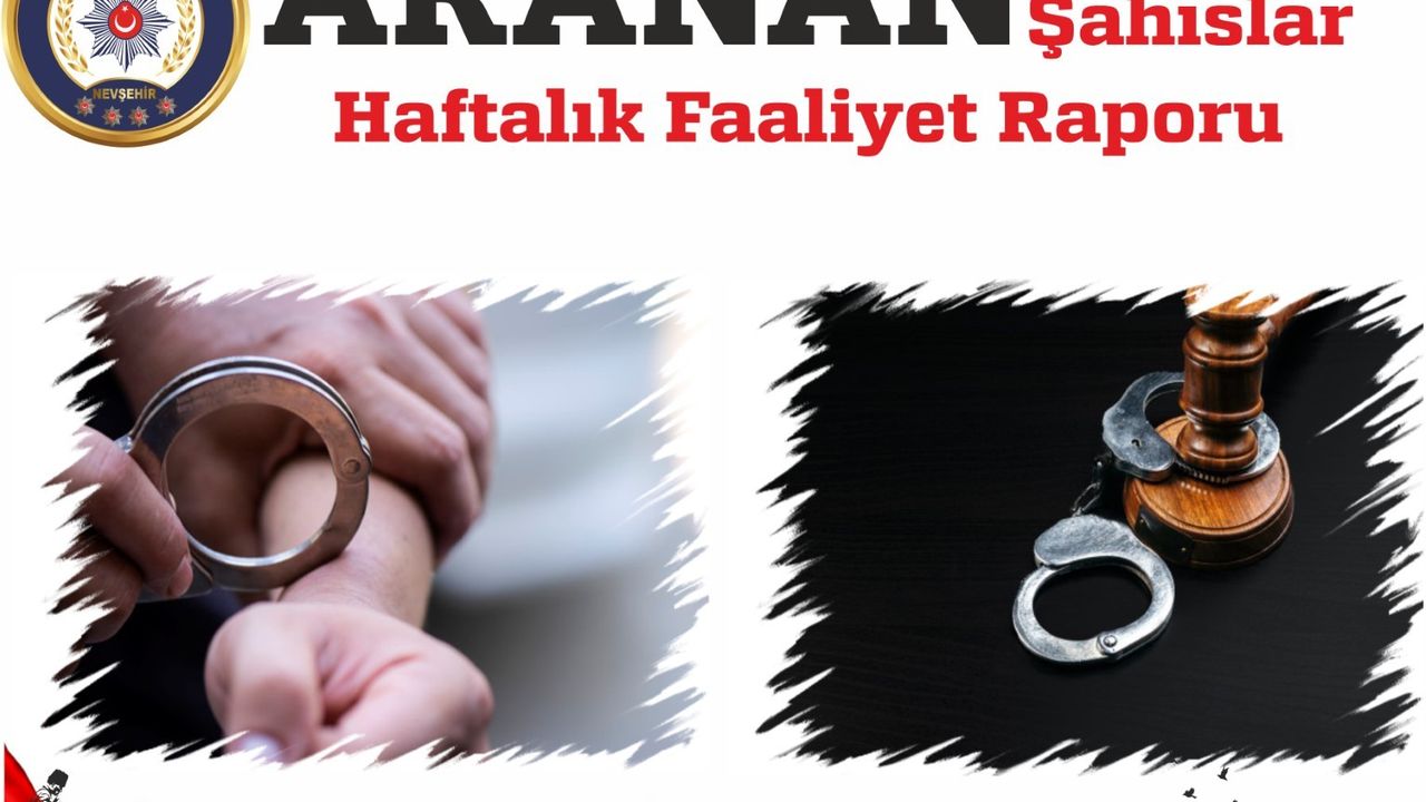Nevşehir İl Emniyet Müdürlüğü Asayiş Şube Müdürlüğü ekiplerince yapılan çalışmalarda; “Ailenin Korunması Tedbirinin İhlali” suçundan aranan hakkında 3 gün hapis cezası bulunan M.H., “Borçlunun Ödeme Şartını İhlal” suçundan aranan ve hakkında 3 ay hapis cezası bulunan G.D., “Basit Yaralama” suçundan aranan ve hakkında 112 gün hapis cezası bulunan O.D., “Silahla Tehdit” suçundan aranan ve hakkında 1 yıl 6 ay hapis cezası bulunan İ.K., “Cinsel Taciz” suçundan aranan ve hakkında 1 yıl 6 ay hapis cezası bulunan A.E., “Göçmen Kaçakçılığı Yapma” suçundan aranan ve hakkında 3 yıl 4 ay hapis cezası bulunan E.K., “Gece Vakti Yağma” suçundan aranan ve hakkında 4 yıl 2 ay hapis cezası bulunan O.K., “Trafik Güvenliğini Tehlikeye Sokma” suçundan aranan ve hakkında 2 ay hapis cezası bulunan E.K., “Borçlunun Ödeme Şartını İhlal” suçundan aranan ve hakkında 3 ay hapis cezası bulunan H.A., “6136 SKM- Basit Yaralama” suçlarından aranan ve hakkında 7 ay 15 gün hapis cezası bulunan B.A., “Müstehcen Yayınların Üretiminde Çocukları Kullanmak” suçundan aranan ve hakkında 5 yıl hapis cezası bulunan Y.B. yakalandı.