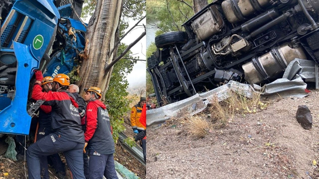 Sivas’ın Koyulhisar ilçesinde yağış nedeniyle kontrolden çıkan sebze yüklü tır, bariyerlere çarparak devrildi. Kazada araçta sıkışan sürücü, AFAD ve itfaiye ekiplerinin 2 saatlik çalışmasıyla kurtarıldı.