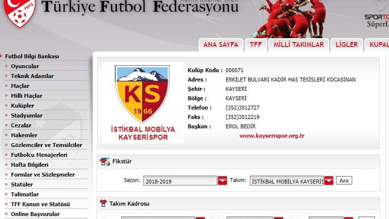 Spor Toto Süper Lig'de mücadele veren ve sponsorluk anlaşması yaparak ismini İstikbal Mobilya Kayserispor olarak değiştiren sarı kırmızılı takımın bilgileri, Türkiye Futbol Federasyonu (TFF) tarafından güncellendi. Kurulduğu günden bu yana her platformda ismi Kayserispor olarak yazılan Kayseri'nin futbol ekibi, artık 2,5 yıl boyunca İstikbal Mobilya Kayserispor olarak anılacak ve yazılacak. Türkiye Futbol Federasyonu da, resmi internet sitesinde gerek kulüp sayfasında gerekse maç programı sayfasında İstikbal Mobilya Kayserispor ismini kullanmaya başladı. [İHA]